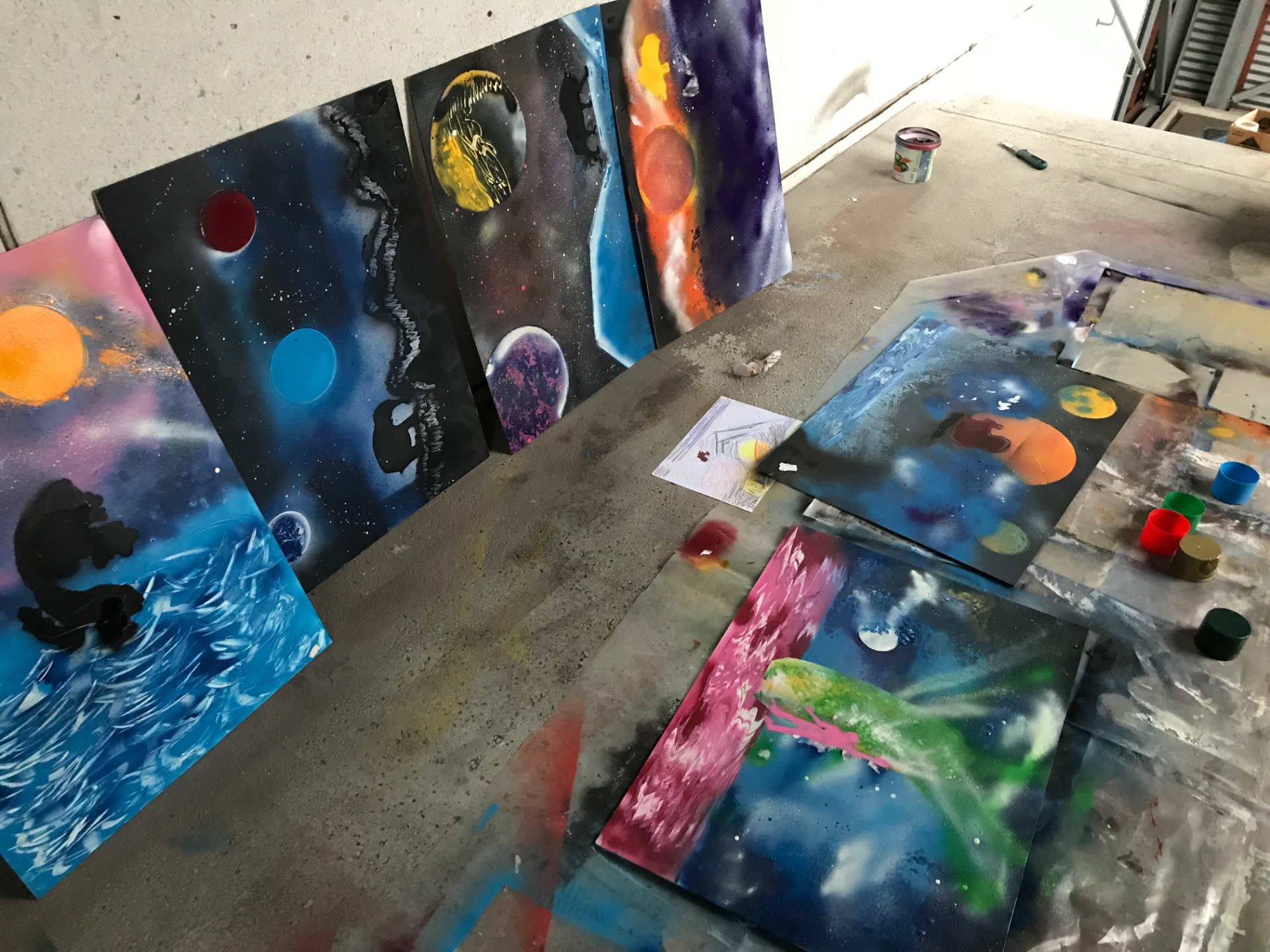Kuva kouluryhmälle järjestetystä spraymaalaus-työpajasta jossa kokeiltiin rakentaa erilaisten muotojen kautta maisemaa. 2020