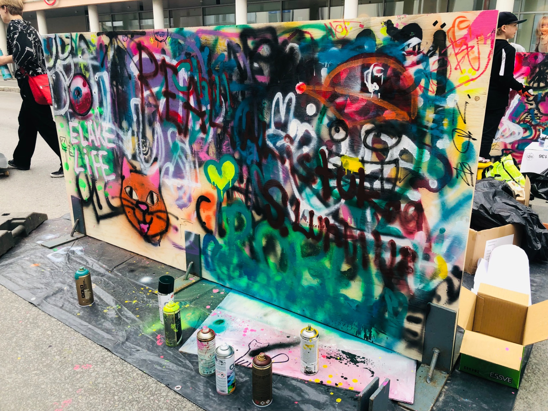 Graffitipajat: Olen vetänyt graffitipajoja, joissa kävijä pääsee toteuttamaan omaa sisäistä ääntään pystytetyille seinämille/kohteille. Pajat ovat osittain ohjattuja, ja niissä on mahdollisuus kokeilla stencil-tekniikkaa. Graffitipajoja olen toteuttanut iästä riippumatta kohderyhmille. Kaikki voivat nauttia graffitin teosta. Tässä kuvassa Mikkeli on Air - tapahtumasta kuva yhdestä seinämästä, jota nuoret ja lapset pääsivät maalaamaan. 2022